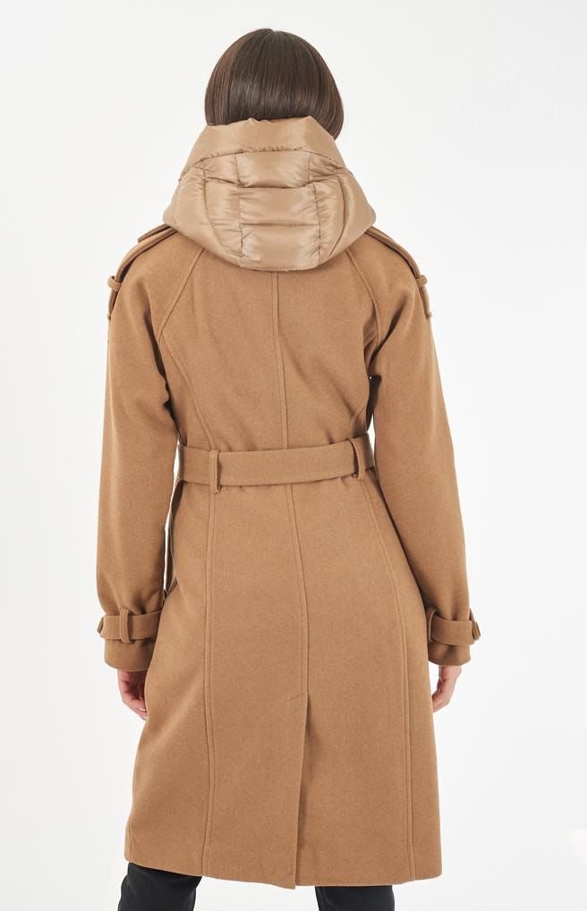 Cappotto donna doppiopetto con finto gilet staccabile.